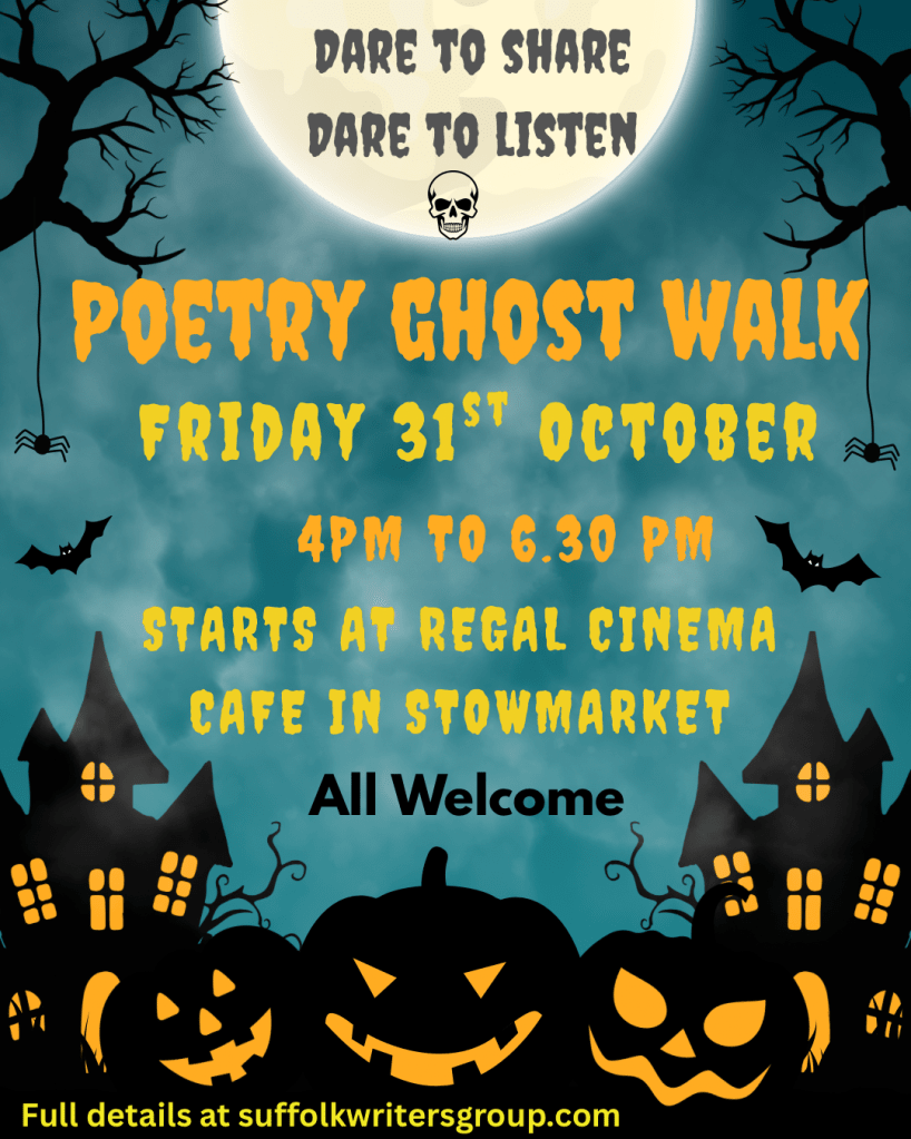 3.45 pm – Poets, performers and fellow walkers start arriving at the Regal Cinema Cafe in Stowmarket. Ghostly costumes are encouraged but not obligatory.